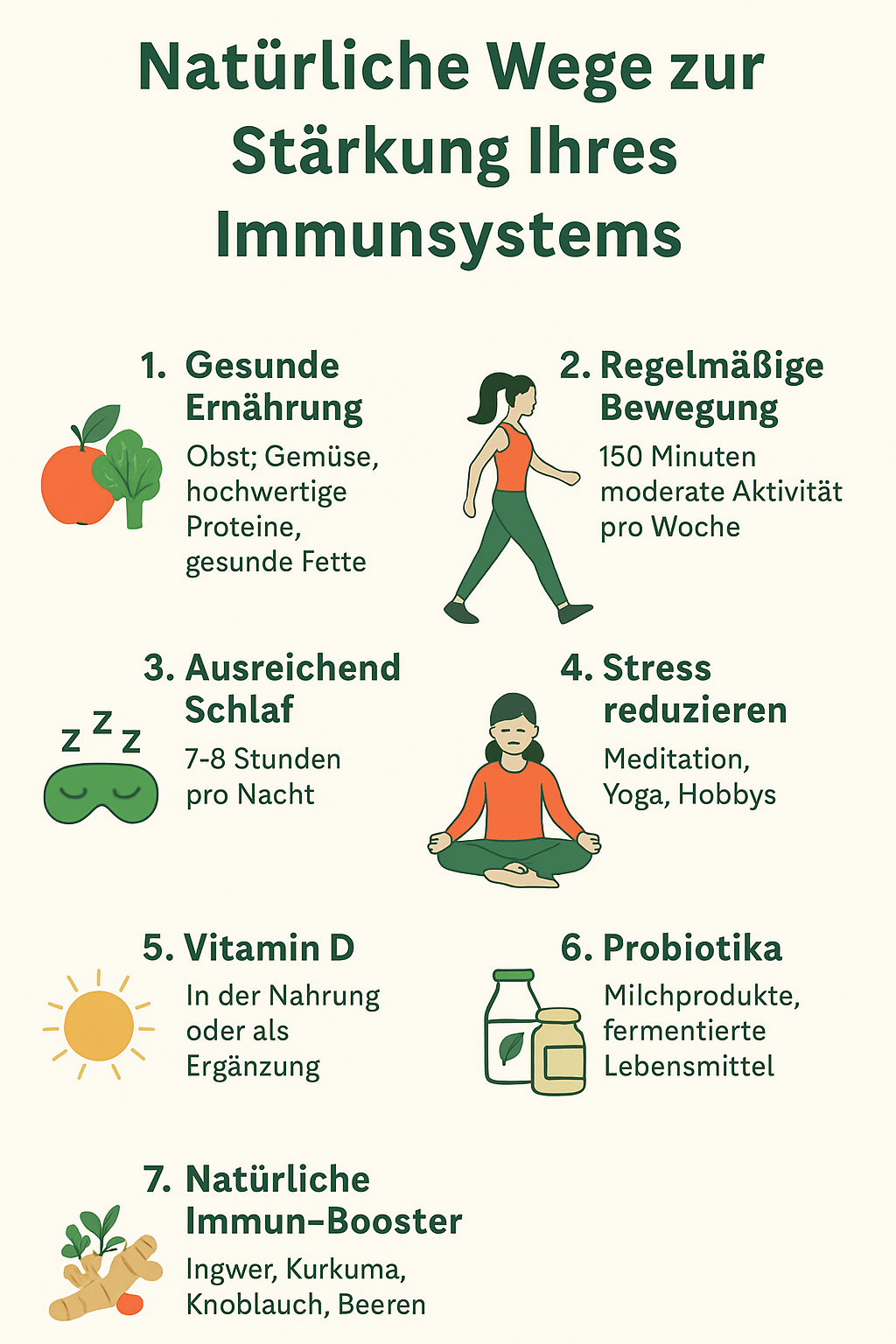 Ihr Immunsystem ist ein leistungsfähiges Schutzsystem, das Sie mit den richtigen Lebensgewohnheiten gezielt stärken können. Mit einer ausgewogenen Ernährung, guter Schlafhygiene, regelmäßiger Bewegung, Stressreduktion, ausreichender Vitamin-D-Versorgung und einer gesunden Darmflora schaffen Sie optimale Voraussetzungen für Ihre Gesundheit.